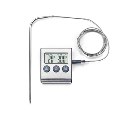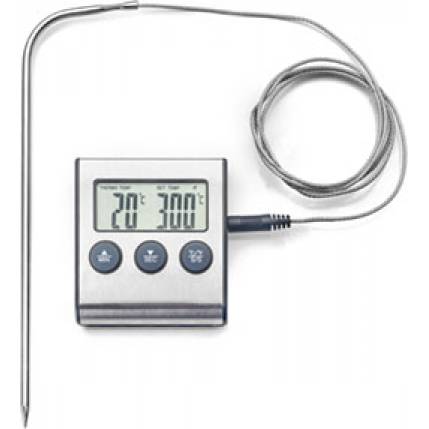 Teploměr se sondou můžete použít ke zjištění propečení masa i při vaření džemů, sirupů či karamelu. Sonda je propojena s teploměrem pomocí provázku (115 cm). Na teploměru lze nastavit cílovou teplotu i čas vaření. Teploměr měří až do teploty 300°C. Rozměry teploměru jsou 6 x 7 cm. Sonda je vyrobena z kvalitního nerezu, teploměr je z plastu. Teploměr je poháněn jednou baterií AAA (není součástí balení). Teploměr má na zadní straně magnet k připevnění na kovové materiály.