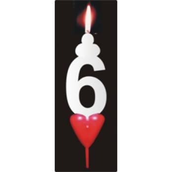 Originální "pokrová" dortová svíčka ve s dekorem kříže na vrchu čísla šest. Svíčka má plastový podstavec ve tvaru červeného srdíčka. Délka svíčky 5,5 cm. Výška plastového podstavce je 3,5 cm.