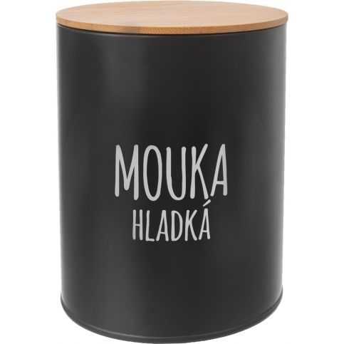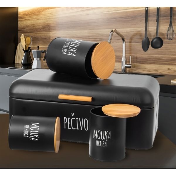 Designová plechová dóza s matným černým povrchem pro uskladnění hrubé pšeničné mouky, vhodné např .