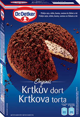 Krtkův dort Dr. Oetker si našel své milovníky jak v řadách dětí, tak i dospělých. Vynikající dort na oslavu narozenin nebo k nedělní kávě. Originální dort pochází z tvořivé kuchyně Dr. Oetker. Lahodný kakaový korpus, šlehačková náplň a banány – to je kombinace, které nejde odolat! Balení obsahuje: 250 g směsi na korpus, 100 g směsi na náplň, 60 g čokoládových vloček K tomu přidáte: Na těsto - 100 g měkkého margarínu nebo másla, 2 veljce (velikost M), 75 ml mléka (7 polévkových lžic). Na náplň - 3 banány, 500-600 ml vychlazené smetany ke šlehání, 100 ml studené vody. Příprava těsta: Směs na těsto, margarín nebo máslo, vejce a mléko dáme do mísy. Šleháme elektrickým ručním šlehačem, nejprve na nejnižším stupni, pak na nejvyšším stupni asi 3 minuty. Těsto vložíme do tukem vymazané dortové formy (doporučujeme 26 cm), uhladíme a pečeme 35-40 minut (elektrická trouba 170°C, horkovzdušná trouba 150°C, plynová trouba střední stupeň). Po upečení oddělíme okraj formy a korpus necháme vychladnout. Úprava korpusu: Po vychladnutí oddělíme dno formy a korpus položíme na dortový podnos. Pomocí lžičky vydlabeme do hloubky 1/2 cm. Ponecháme 1 cm široký okraj. Vydlabanou část korpusu v misce nahrubo rozdrobíme. Příprava náplně a zdobení dortu: Banány oloupeme, podélně rozpůlíme a plochou stranou uložíme na vyhloubený korpus. Smetanu ke šlehání vyšleháme do tuha. Směs na náplň dáme do větší mísy a přidáme odměřené množství vody. Mícháme 1/2 minuty ručně metličkou. Poté ihned ve dvou fázích přimícháme šlehačku a nakonec čokoládové vločky. Šlehačkovou náplň navršíme na korpus kopulovitě až ke kraji a posypeme rozdrobeným korpusem. Necháme v ledničce asi 3 hodiny ztuhnout. g