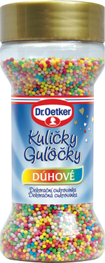 Pestrobarevné duhové kuličky dodají vašemu pečení nebo dezertům veselý vzhled. Stačí nasypat na čokoládovou polevu, krém, zmrzlinu nebo šlehačku a hned se zákusek promění v umělecké dílo. A děti Vám budou s radostí pomáhat se zdobením! Pro pohodlné, zábavné a kreativní zdobení vánočního cukroví, dortů, muffinů a jiných zákusků.
