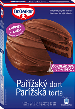 Lahodný čokoládový dort s vláčným čokoládovým korpusem a jemně nadýchaným krémem z čokoládové pařížské šlehačky je kombinací pro ty největší mlsouny. Porce poctivého čokoládového dortu nejen zasytí, ale vykouzlí na tváři spokojený úsměv i v té nejhorší náladě. Balení obsahuje: 450 g směsi na vláčný korpus, 100 g směsi na lehký pařížský krém K tomu přidáte: Na korpus - 260 ml vody, 30 ml oleje (3 polévkové lžíce), 1-2 vejce (velikost M). Na krém - 400-500 ml smetany ke šlehání Příprava krému: Obsah sáčku se směsí na krém vysypeme do hrnce. Přilijeme smetanu ke šlehání, za stálého míchání přivedeme do varu a 1 minutu povaříme. Odstavíme z plotny, necháme trochu zchladnout, poté vložíme do chladničky a necháme minimálně 3 hodiny vychladnout. Nejlépe je nechat pařížskou smetanu vychladit přes noc. Příprava korpusu: Obsah sáčku se směsí na korpus vysypeme do mísy, přidáme vodu, olej a 1 nebo 2 vejce. Těsto vymícháme vařečkou nebo metličkou do hladka. Hladké těsto nalijeme do vymazané a moukou vysypané dortové formy (doporučujeme 26 cm), vložíme do trouby  a pečeme 35-40 minut (elektrická trouba 150°C, horkovzdušná trouba 130°C, plynová trouba dtřední stupeň). Dokončení dortu: Upečený korpus necháme vychladnout a poté jej jednou podélně překrojíme. Vychlazenou pařížskou smetanu vyšleháme elektrickým ručním šlehačem na středním stupni do tuha. Polovinou pařížské šlehačky potřeme spodní díl korpusu, přikryjeme vrchním dílem korpusu a zbytkem šlehačky potřeme vrch a okraje dortu.