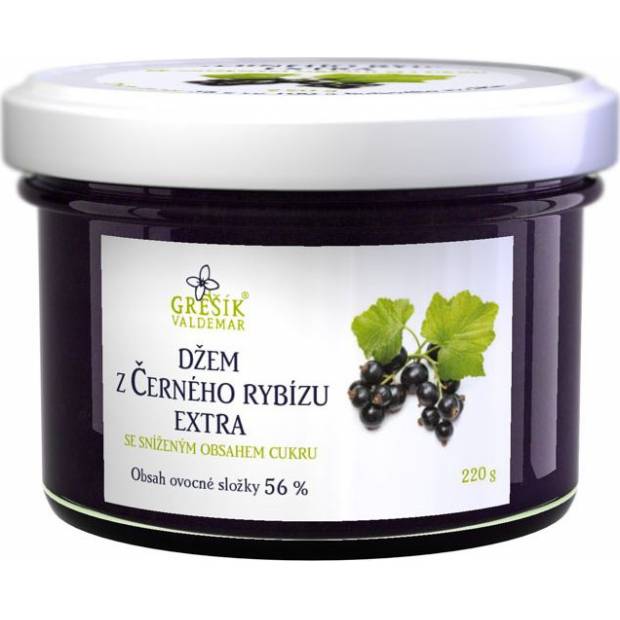 Džem z černého rybízu extra se sníženým obsahem cukru Grešík. Balení 220 g.
