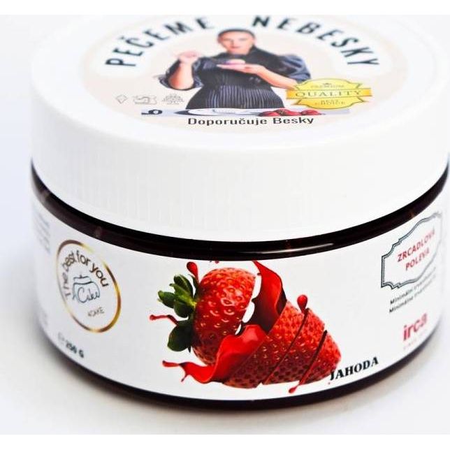glukózo-fruktózový sirup, cukr, voda, jahody (3%), zahušťovadlo pektin, modifikovaný škrob, okyselovadlo kyselina citronová, konzervant sorban draselný, aroma, výtažek z černého rybízu, barviva košenila a beta karoten