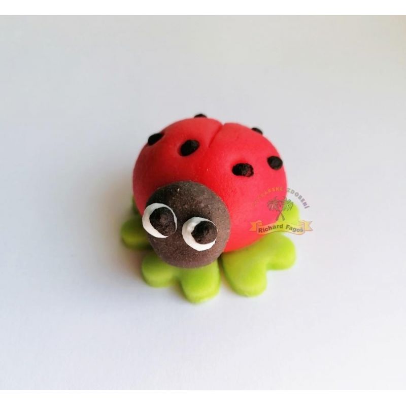 Ručně modelovaná 3D beruška. Na výrobu byla použita modelovací kokosová hmota s příchutí a aroma sladkých mandlí. Lze s ní ozdobit dorty, rolády, zákusky a další.