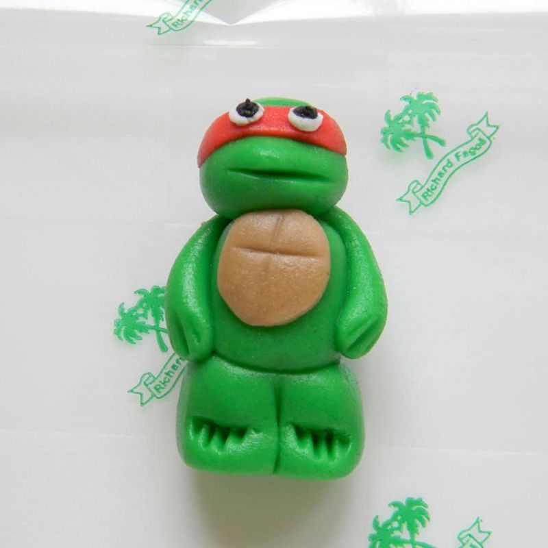 Ručně modelovaná 3D postavička v podobě želvy ninja. Na výrobu byla použita modelovací kokosová hmota s příchutí a aroma sladkých mandlí. Lze s ní ozdobit dorty, rolády, zákusky a další.