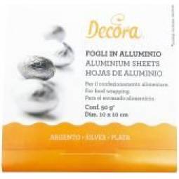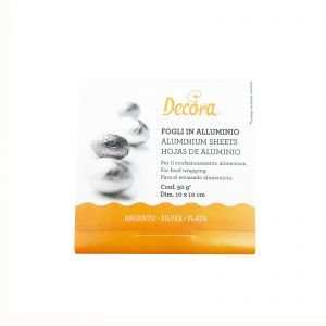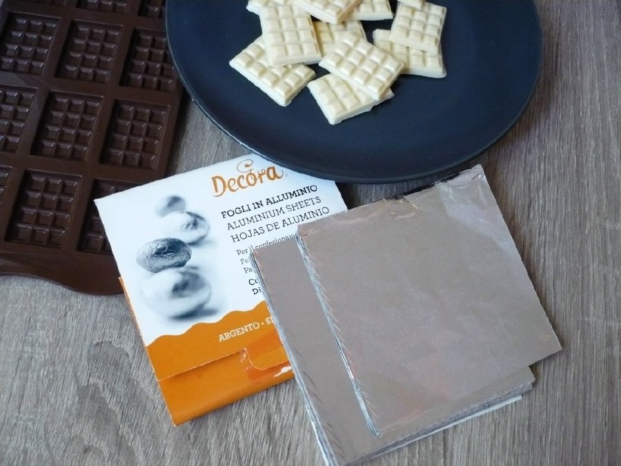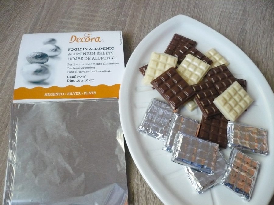 Barevné hliníkové folie pro stylové balení čokolád a pralinek. Stříbrná barva, 10 x 10 cm – 50 g, v balení 150 ks. Na výběr i další barvy.