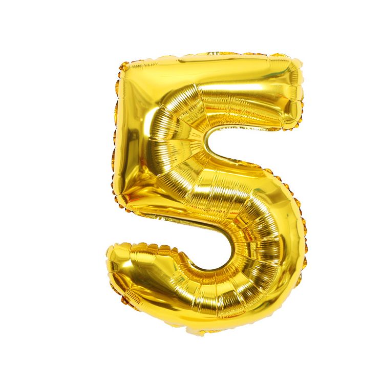 Zlatý balónek číslo 5. Balónek je vyrobený z pevné fólie. Po nafouknutí vzduchem vydrží naplněný i ně