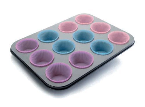 Pečení oblíbených muffinů si velmi zjednodušíte s touto soupravou. Forma o rozměrech 39 x 27 x 3,5 centimetrů je vyrobena z kvalitního ocelového plechu s teflonovým povrchem a připravena pro pečení 12 kusů muffinů. Košíčky jsou z kvalitního silikonu v modré a lila barvě a můžou se používat opakovaně. Plech i košíčky snadno umyjete v myčce na nádobí.