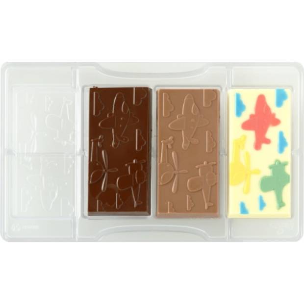 Polykarbonátová forma na čokoládu s motivem letadel.