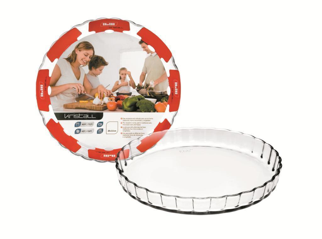 Formy na koláč se vyrábějí z různých materiálů, ale žáruvzdorné sklo patří mezi ty oblíbené. Tato forma je o průměru 28 cm a výšce 3,5 cm. Má hezký vlnitý okraj, snáší vysoké teploty a je vhodná pro elektrické, plynové ale i mikrovlnné trouby. Lze ji vkládat i do mrazničky. Výhodou průhledných forem je to, že vidíme jak se koláč zespodu a z boku upekl a zda se nepřipaluje. Musíme se pouze vyvarovat teplotních šoků s rozdílem přes 100°C. Rozpálenou formu s upečeným koláčem odkládáme přímo z trouby buď na mřížku, nebo můžeme použít dřevěnou nebo korkovou podložku. Vyvarujeme se odkládání na všechny studené povrchy např. nerez, kámen, mramor nebo třeba i mokrou utěrku. Formu lze umývat v myčce nádobí.