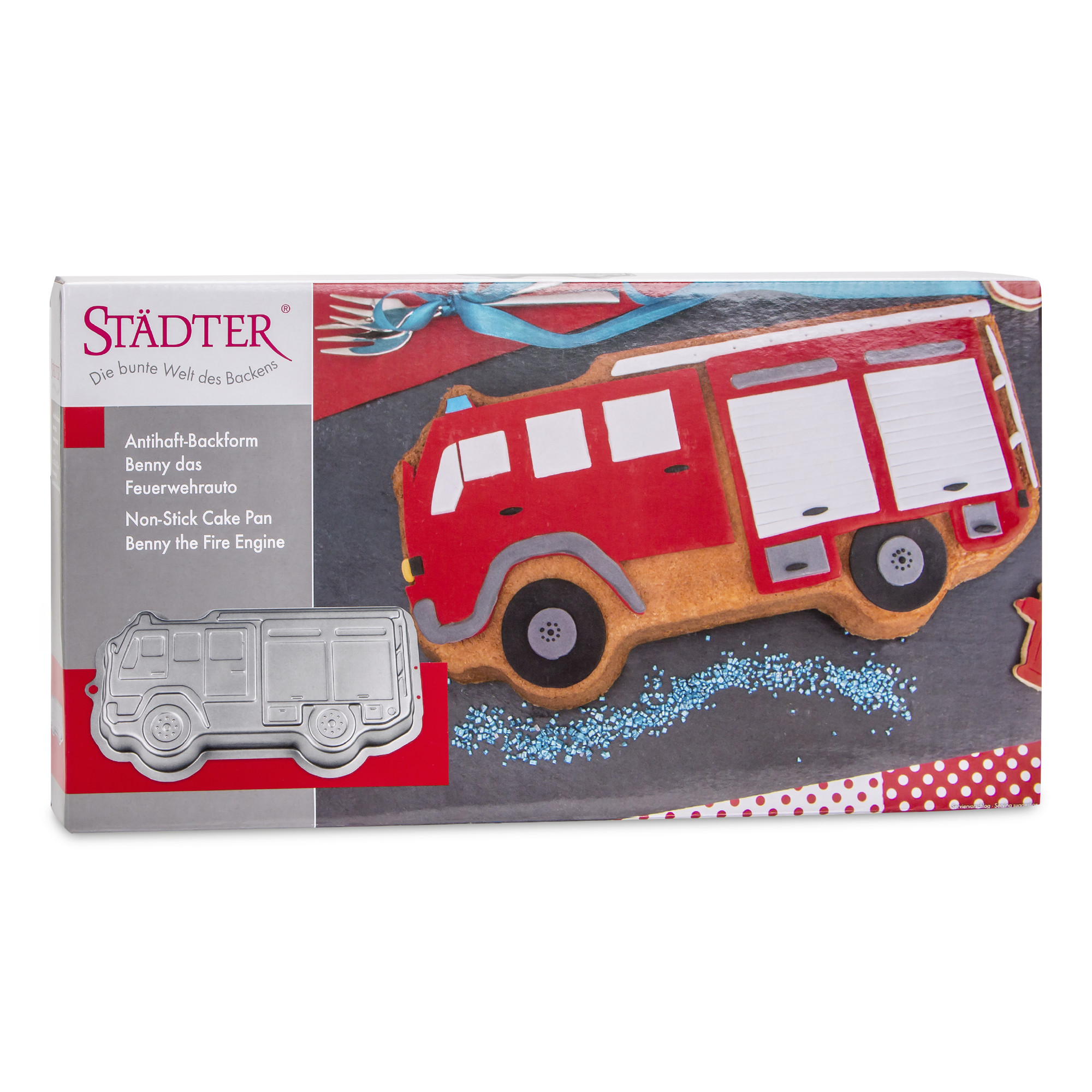 Forma na pečení ve tvaru hasičského auta nejen na dětské dorty k narozeninám i jiným příležitostem. Objem 1,5 l. Rozměry 33x17cm.