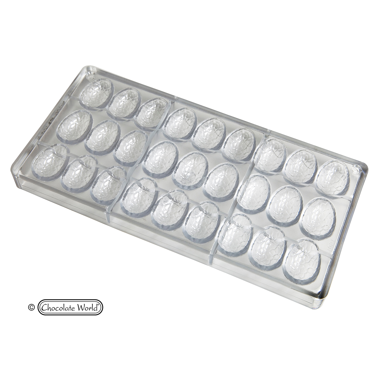 Polykarbonátové formy Chocolate World jsou používány profesionálními čokoládovnami po celém světě. Chocolate World je světovým lídrem na trhu polykarbonátových forem na čokoládu pro profesionální čokoládovny a nabízí největší standardní sortiment forem na světě. Každá forma je vyrobena v Belgii za použití vysoce leštěných nástrojů podle výrobních norem certifikovaných ISO a lidské kontroly kvality. Polykarbonátová forma umožní vyrobit dokonalou čokoládu. Tato vysoce kvalitní evropská forma se snadno používá, vaše čokoláda bude mít lesklý a lesklý povrch a bude se snadno vyjímat. Chcete-li získat barevné čokoládové kousky, natřete si formu tenkou vrstvou barevného kakaového másla, než formu naplníte čokoládou. Design této formy umožní vytvarovat dokonalé tvary s hladce opracovanými liniemi.