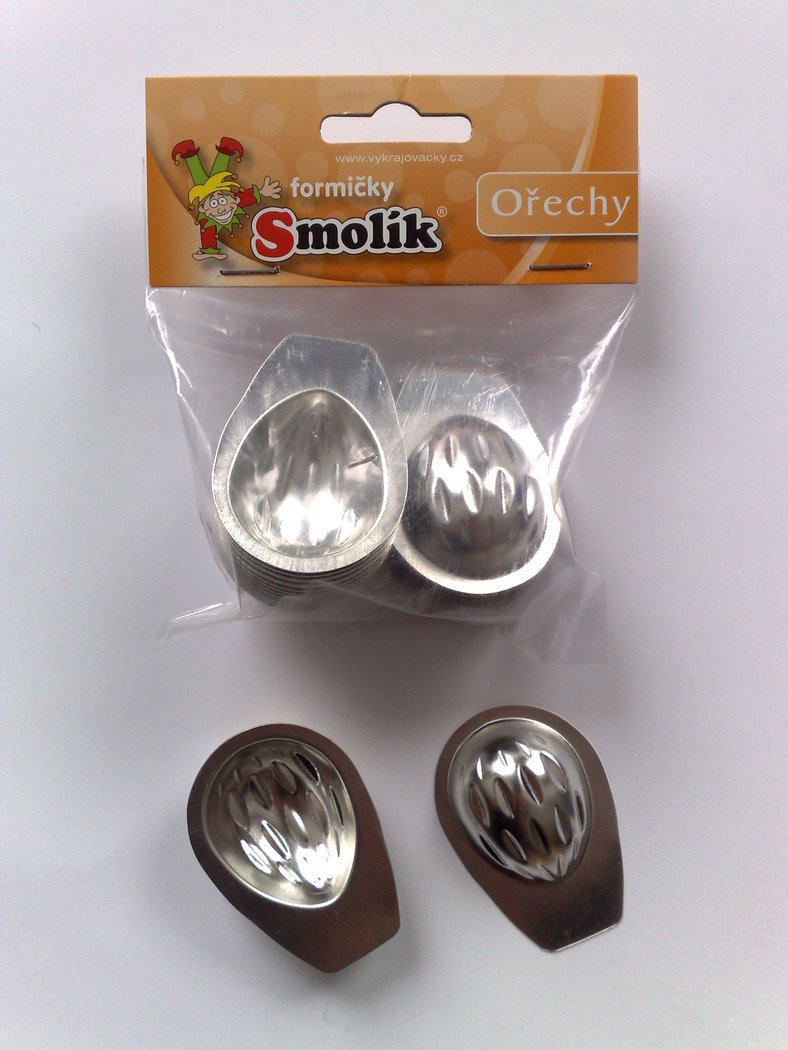 Vyklápěcí formičky z pocínovaného plechu ve tvaru ořechů.