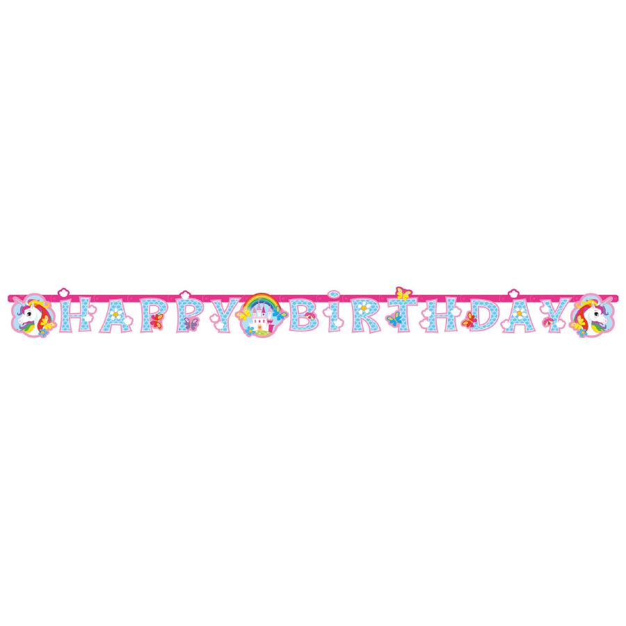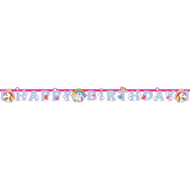Narozeninová girlanda Happy Birthday Unicorn. Rozměry 180 x 15 cm.