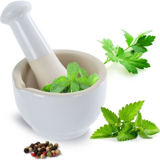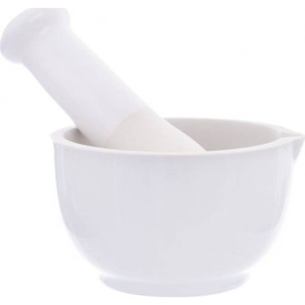 Hmoždíř s výlevkou na drcení koření, bylinek, přípravu pesta. Materiál: kamenina. Vnitřní část hmoždíře a silnější strana tloučku je neglazovaná - pro lepší účinek drcení. Rozměry: vnitřní pr. 7,5 cm, vnější 9 cm, v. 6 cm, délka tloučku 12,5 cm.