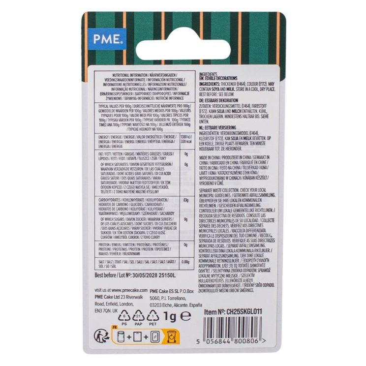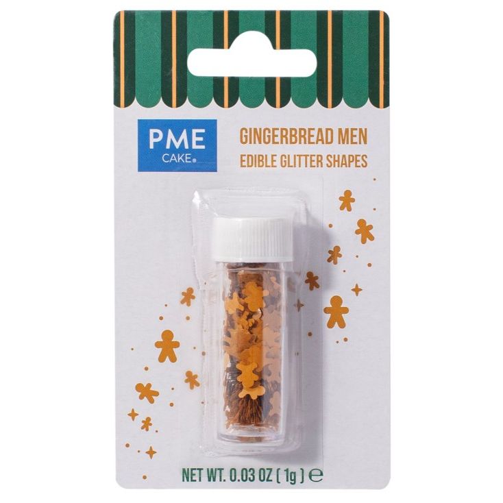Tyhle miniaturní třpytivé perníčky od PME promění každý dezert v malý vánoční zázrak. Stačí špetka a tvoje cukroví, dorty nebo cupcakes získají kouzelný sváteční dotek — a to během pár vteřin. Vánoční edice PME Edible Glitter Shapes obsahuje drobné perníčkové postavičky, které se krásně lesknou a vytvářejí efekt malých dekorativních „confetti“.