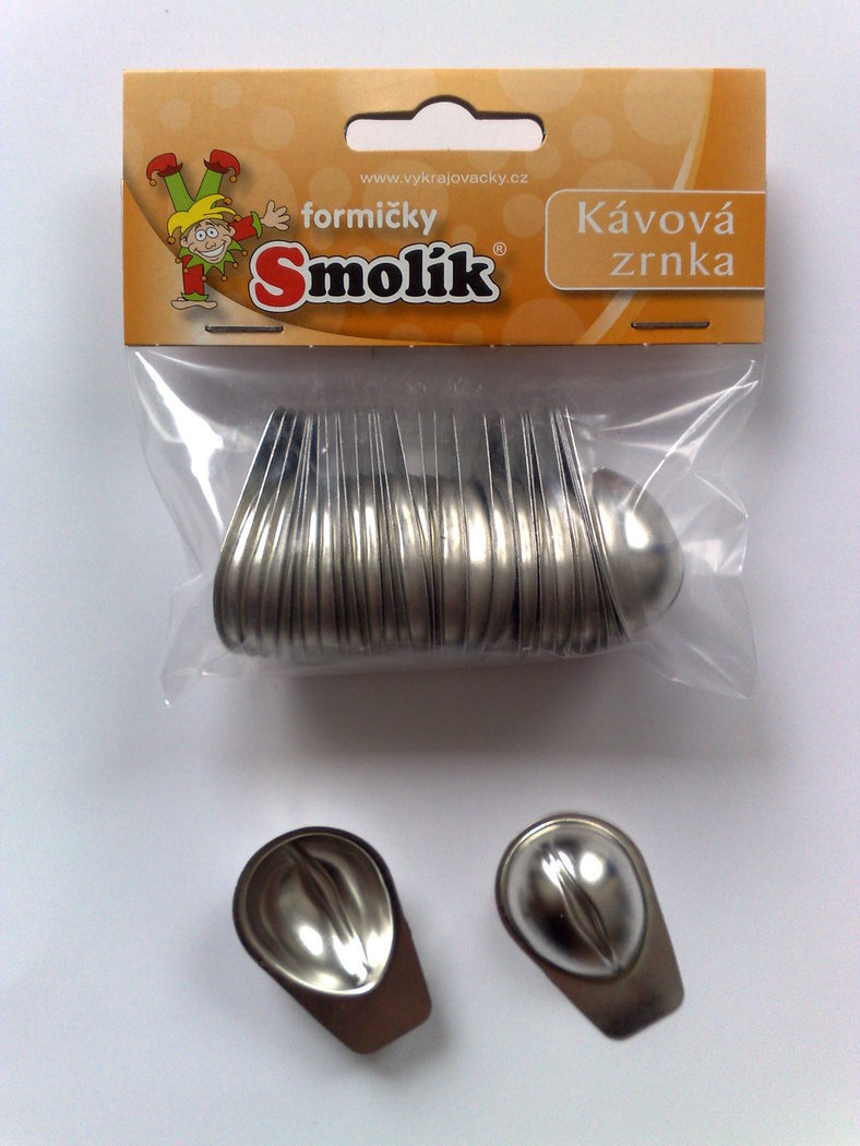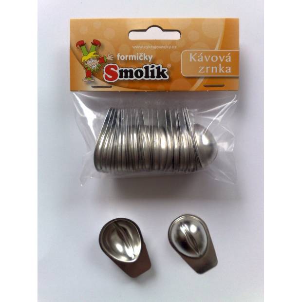 Sada dvaceti kusů formiček z pocínovaného plechu ve tvaru kávových zrn, efektní a přitom velmi jednoduchý vzor. Formičky lze použít nejen pro pečení, snadno jejich pomocí vytvoříme i ozdobná kávová zrnka například z marcipánu nebo fondánu.