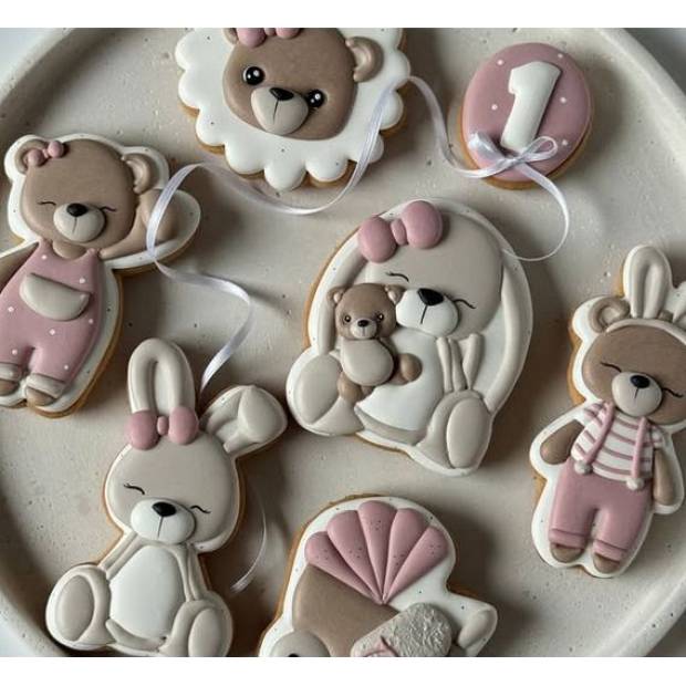Transfer je část perníčku, kterou připravíš dopředu na fóliia po zaschnutí přilepíš na perníček. Existují i tzv. transfer sheetss hotovými vzory – položíš je pod speciální nepřilnavou fóliia podle nich maluješ. Případně si můžeš nakreslit vlastní motiv na papír a položit pod fólii. Nejčastěji se takhle připravují drobné detaily, jako mašličky, kytičky, srdíčka, ale stejně dobře lze tímto způsobem vytvořit i třeba medvídka nebo jiný větší motiv.