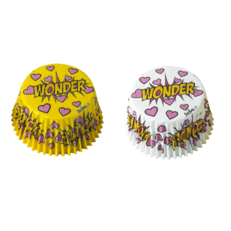 Bílé a žluté zapékací košíčky s nápisem Wonder a srdíčky na muffiny Decora. Jednorázové košíčky na pečení v pečícím papíru průměr 5 cm. Kvalita Made in Italy, vynikající pro milovníky domácích zákusků, pečiva a dortového designu. Kulaté pečící papírové košíčky na muffiny se zvlněnými okraji, bílý nebo žlutý podklad s nápisem Wonder a srdíčky, vyrobené z potravinářského papíru odolného do +220°C. Vyrobeno z vysoce kvalitních profesionálních materiálů certifikovaných pro styk s potravinami. Rozměry: průměr ?5 cm, výška 3,2 cm. Balení 36 ks jednorázových pečicích košíčků v pečícím papíru