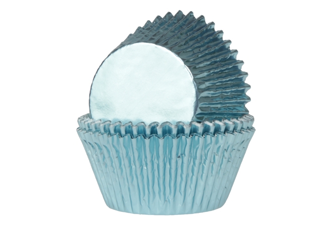 Papírové košíčky na muffiny potažené světle modrou folií vhodné na pečení.