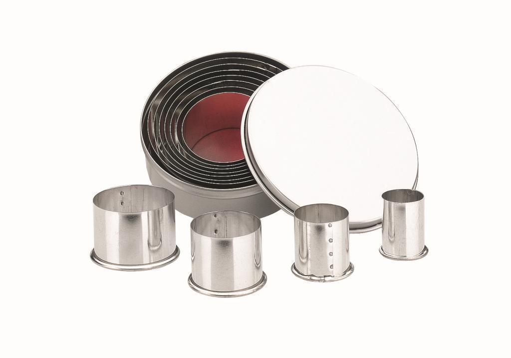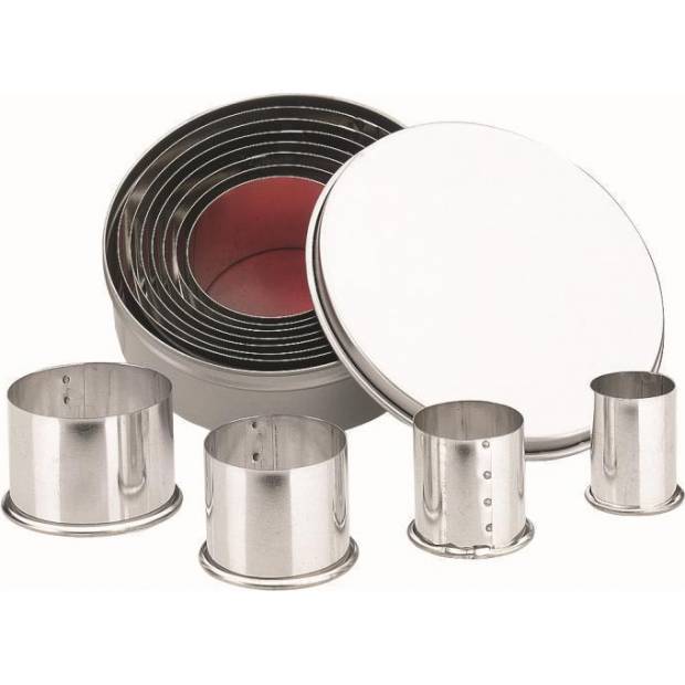 Sada nerezových vykrajovátek v praktickém boxu. Jednotlivá kolečka do sebe zapadají. Jsou vyrobena z kvalitního nerezu. Průměry koleček jsou 2; 3; 4; 4,5; 5; 6; 6,5; 7; 8; 8,5; 9 cm. Výška koleček je 2 cm.