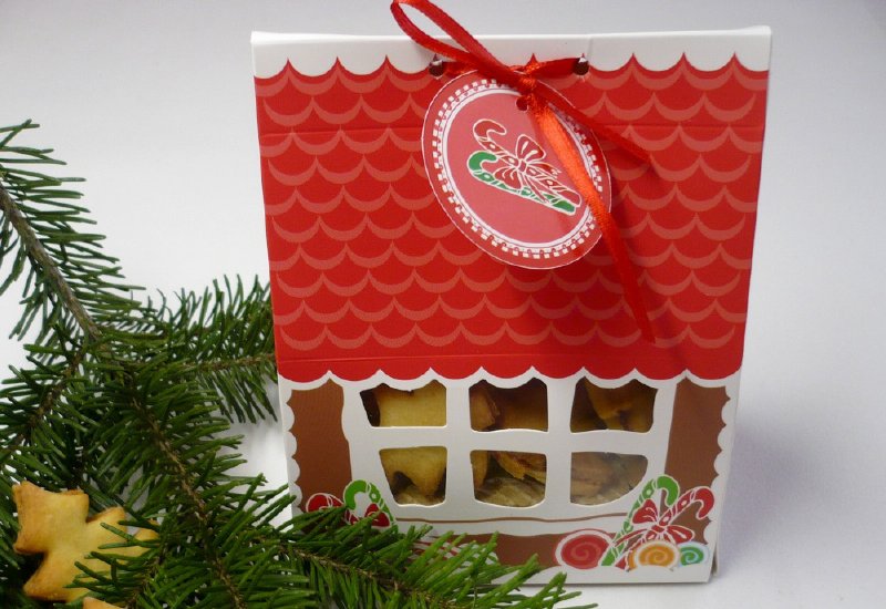 Praktická krabička na cukroví v podobě perníkové chaloupky je opakovatelně použitelná.