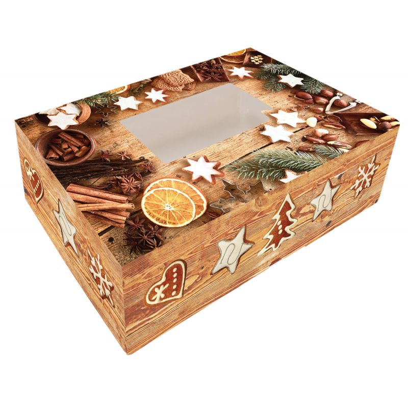 Krabička na vánoční cukroví či výslužku skládací, s průhledným okénkem - motiv imitace dřeva. Rozměry 25 x 15 x 7 cm.