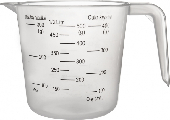 Odměrka s uchem a výlevkou. Odměrky na tekutiny, cukr, mouku, olej, mák, rýži. Materiál: plast. Transparentní. Rozměry: objem - odměrka do 500 ml, pr. 10 cm, v. 10 cm.