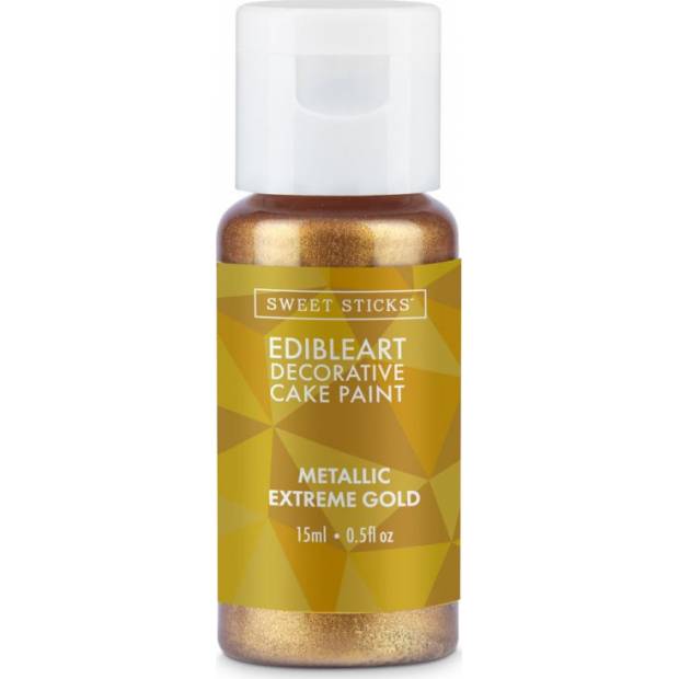 Metalická jedlá umělecká barva Sweet Sticks je perfektní způsob, jak přidat trochu třpytu do vašich lahodných výtvorů. Barva je připravena k použití přímo z lahvičky, takže ji není třeba míchat s žádnými dalšími přísadami. Po nanesení a zaschnutí je pigment uzavřen v povrchu – žádný prach nebo šmouhy. Je vhodná na marshmallows, fondant, ganache, modelovací čokoládu, atd.