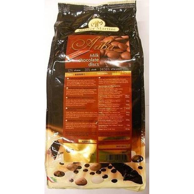 Pravá mléčná čokoláda obsahuje 32% kakaa Je určena na výrobu polev a čokoládových figurek. Ariba, zrozená z vášně pro kakao, je čokoládová řada Master Martini. Přesnost ve výběru surovin v místech původu, výhradní použití kakaového másla a přírodní vanilky, výzkum harmonie chutí, rozmanitost chutí a vynikající zpracovatelnost jsou vlastnosti, které zaručují čokoládu vysoké hodnoty. Čokoládová poleva patří mezi produkty, které splňují potřeby řemeslníků v různých aplikacích řemeslné čokolády a pečiva. Výsledkem je čokoláda, která se snadno používá a je všestranná, což zaručuje vysokou úroveň výtěžnosti. Složení: cukr, kakaové máslo, sušené mléko, kakaová hmota, emulgátor (E322 sójový lecitin), přírodní vanilková příchuť