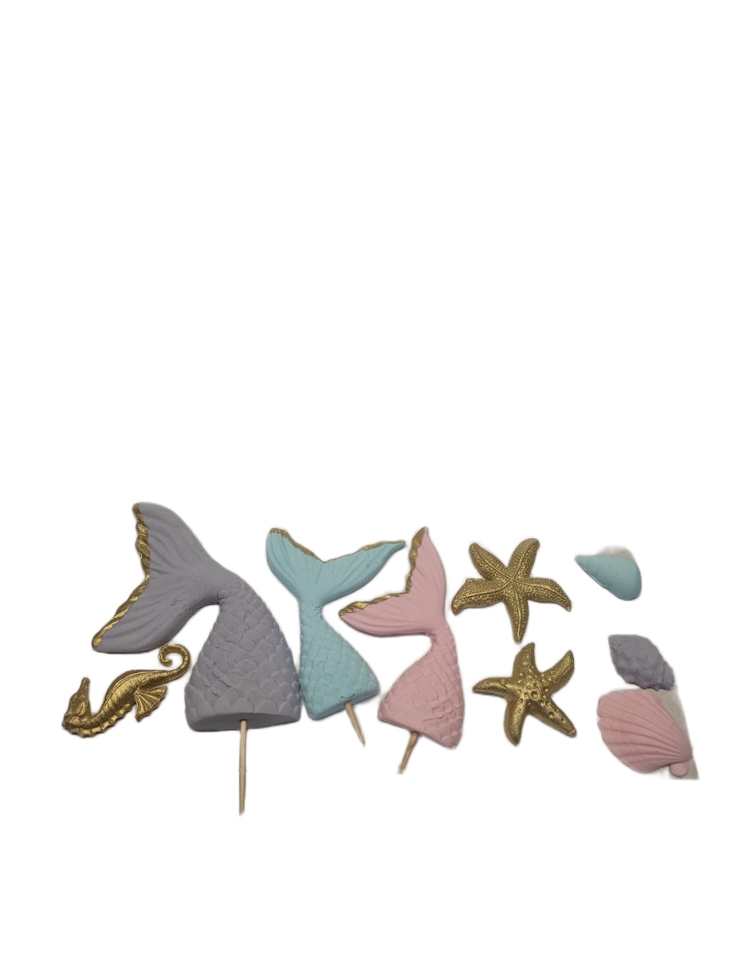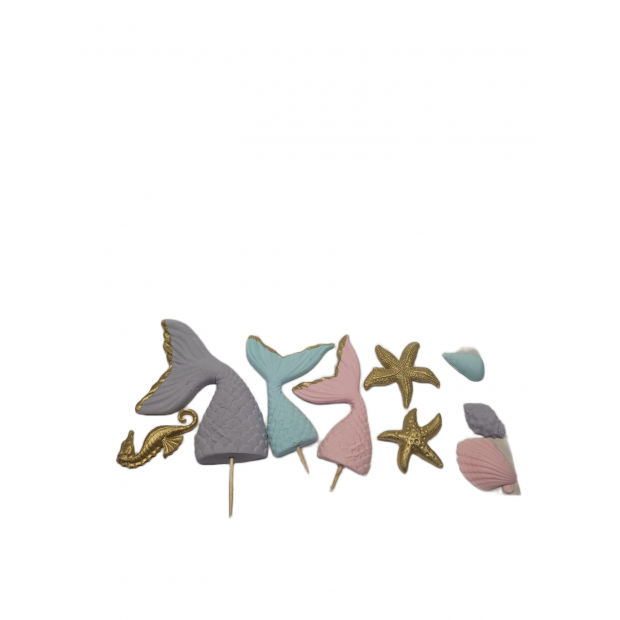 Zápich s motivem ocásků mořské panny je dekorace, která okamžitě promění tvůj dort v podmořské království. Každý ocas je ručně vymodelovaný do nejmenšího detailu – jemná textura šupinek, krásné tvary, pastelové nebo třpytivé barvy a elegantní linie, které připomínají skutečný pohádkový svět mořských víl. Zápich působí luxusně, hravě a je ideálním středobodem mořského dortu.
