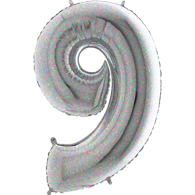 Holografický balónek číslo 9. Balónek je vyrobený z pevné fólie. Po nafouknutí vzduchem vydrží naplněný i několik týdnů, pokud si balónek necháte naplnit héliem vydrží pevně nafouklý a bude létat až 4 dny. K nafouknutí balónku používejte vždy speciální pumpičky k tomuto určené, pokud použijete kompresor s velkým tlakem, může balónek prasknout. Nevhodné pro děti do 3 let. Hélium nevdechujte.