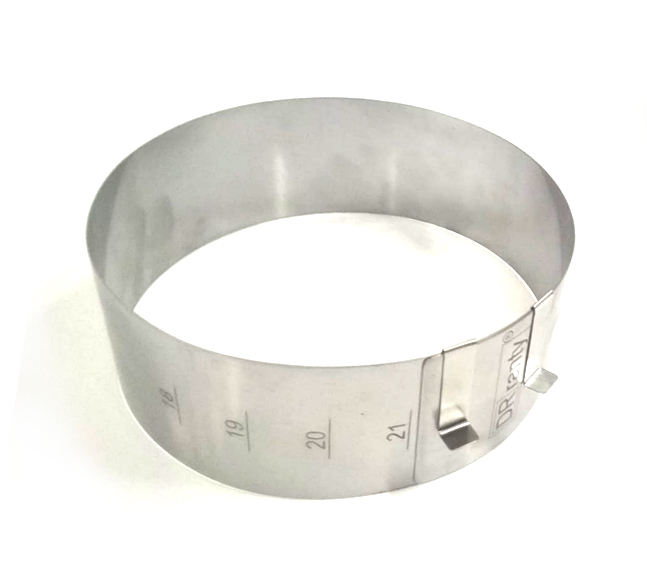 Kruhová nastavitelná forma na dort. Nastavitelný okraj formy o průměru 18 - 21 cm. Má praktickou stupnici (každý 1 cm), díky níž můžete přesně nastavit zvolený průměr těsta. Forma je 8 cm vysoká. Vyrobeno z odolné a deformační nerezové oceli s certifikátem. Sada obsahuje dvě montážní spony. Cukrářská kruhová forma je alternativou k tradičním plechům na pečení. Naproti tomu je mnohem funkčnější, protože ji lze libovolně upravovat. Použití ráfku mimo jiné usnadňuje žádné dno a dvě spony připevněné k sadě, které slouží k upevnění jejích stran. Postačí položit papír na pečení nebo pergamen na jakýkoli povrch, postavit na něj nastavitelný okraj a poté do něj nanést hmotu. Po vyjmutí z trouby si pečivo udrží svůj dokonalý tvar. Navíc je jednodušší rozdělit jej na porce než sladkosti na klasickém plechu na pečení. Vyrobeno z odolné a deformační nerezové oceli s certifikátem. Sada obsahuje dvě montážní spony. Cukrářská kruhová forma je alternativou k tradičním plechům na pečení. Naproti tomu je mnohem funkčnější, protože ji lze libovolně upravovat. Použití ráfku mimo jiné usnadňuje žádné dno a dvě spony připevněné k sadě, které slouží k upevnění jejích stran. Postačí položit papír na pečení nebo pergamen na jakýkoli povrch, postavit na něj nastavitelný okraj a poté do něj nanést hmotu. Po vyjmutí z trouby si pečivo udrží svůj dokonalý tvar. Navíc je jednodušší rozdělit jej na porce než sladkosti na klasickém plechu na pečení.