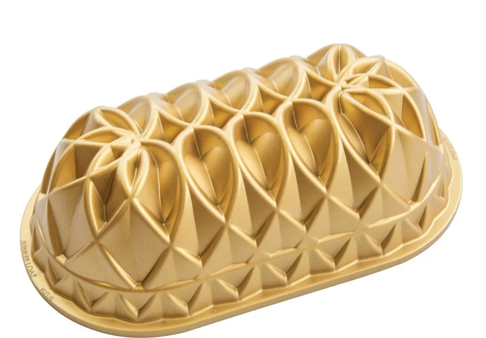 Forma na chlebíček má tvar broušeného diamantu a elegantní zlatý design. Forma je vyrobena z litého hliníku, který poskytuje jemné detaily a vynikající pečicí výkon. Výrazný nepřilnavý vnitřek usnadní používání formy na pečení. Odolná nádoba z litého hliníku rychle a rovnoměrně distribuuje teplo, aby podpořila rovnoměrné pečení a výsledkem byla delikátní zlatá kůrka. Není určena pro mytí v myčce nádobí. Rozměry 29 x 16,2 x 7,3 cm.