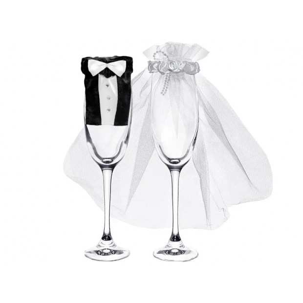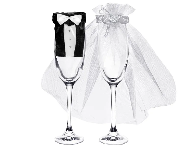 Obleček na skleničky s motivy ženicha a nevěsty pro rozpoznání skleniček.