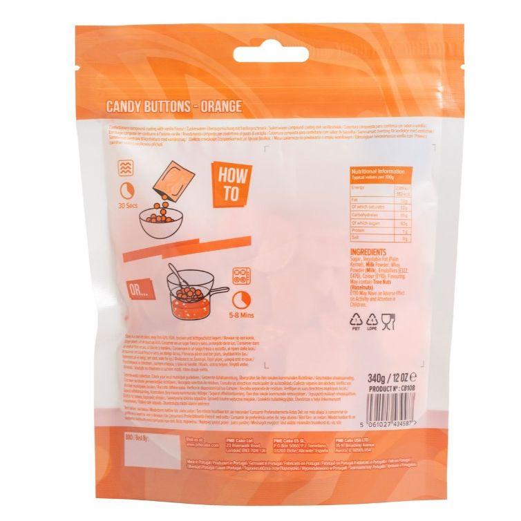 Cukrové pecky od PME představují barevný způsob, jak oživit vaše dorty a dobroty. Snadno se používají, vložte je do misky vhodné do mikrovlnné trouby a jednoduše je rozpusťte, nalijte a poté dle potřeby ztuhněte. Po rozpuštění je můžete použít k přidání polev na dorty, namáčení, potahování, na sladké a cake pops nebo do formiček na bonbóny. Nejenže dobře vypadají, ale i skvěle chutnají! Ideální na dorty, sušenky, muffiny, čokoládové formičky, namáčení marshmallow a ovoce, nebo dokonce jako barevná kapka na dezerty. Cukr, palmový tuk, sušené mléko, syrovátkový prášek (mléko), emulgátory (E322, E476), barviva (E133, E102), aroma. E102 může mít nepříznivý vliv na aktivitu a pozornost dětí.