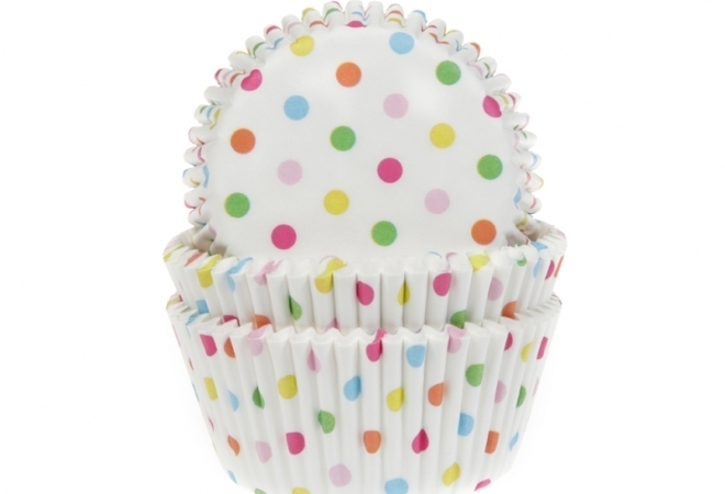 Sada 50 nápaditě vyhlížejících cukrářských košíčků na pečení pro jednoduchou a rychlou přípravu mini dezertů. Bílé košíčky s puntíky v barvě fialové, zelené, žluté, modré. Vhodné na pečení.