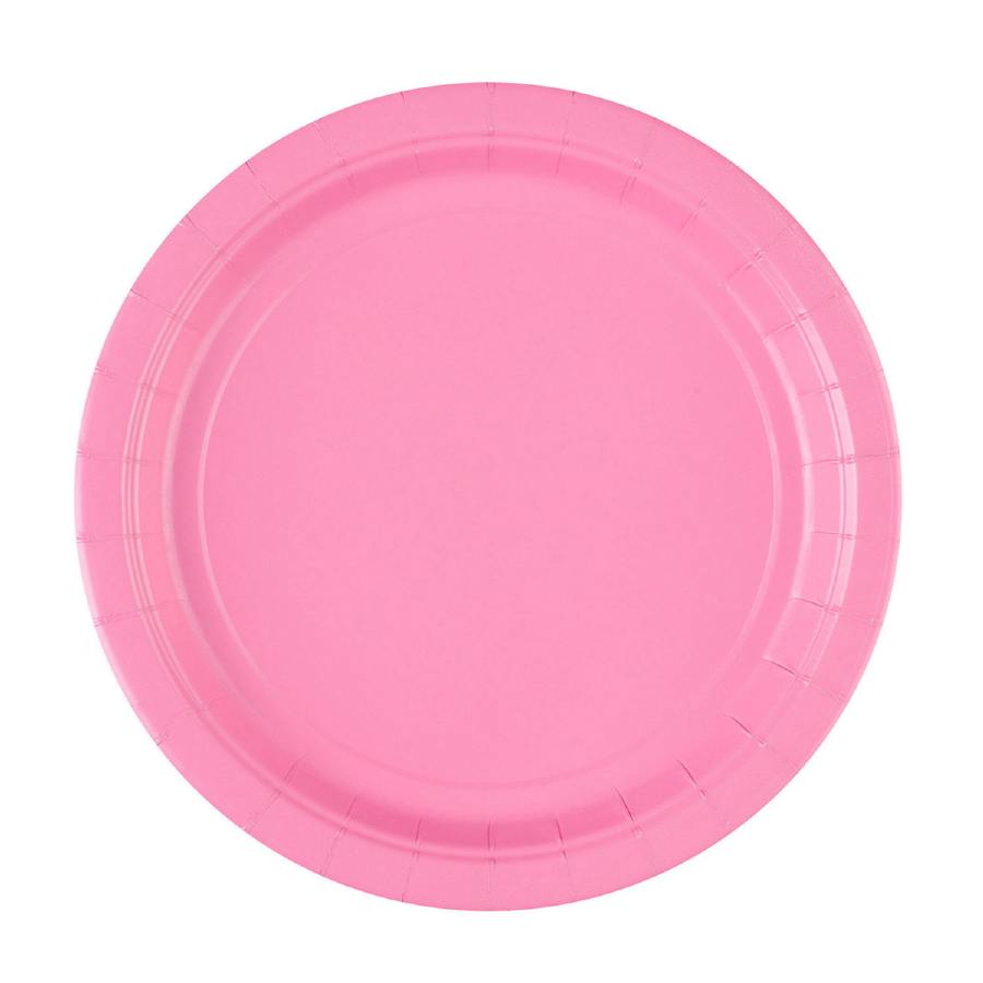 Kulaté papírové talíře jsou růžové. Můžete je kombinovat s ubrousky a ubrusy, papírovými kelímky a dalšími párty výrobky ve stejném designu. Obsahuje 8 kusů. Průměr talíře je 22,8 cm.