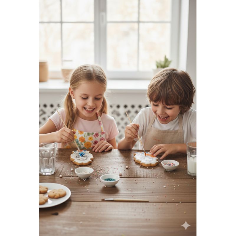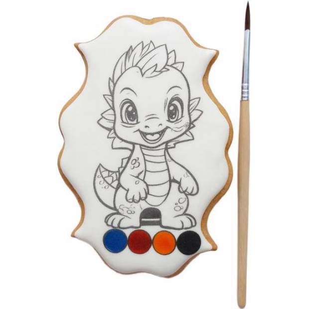 Voňavý perníček s motivem dinosaura je potažený bílou polevou a připravený k vybarvení jedlými potravinářskými barvami. V balení najdete i štěteček – stačí jen trocha vody a malí umělci mohou dát svému dinosaurovi jedinečný vzhled.