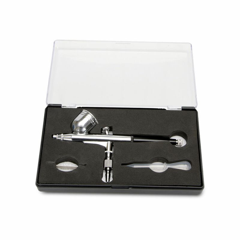 Tato airbrush pistole od Stadter má 2-pákovou funkci pro regulaci tlaku vzduchu a množství barviva. Protože má tato pistole tlakový regulační ventil zabudovaný do spouště, můžete během stříkání nastavit intenzitu paprsku. Od velmi přesných v přímé linii až po barevný nádech v jemné mlze. To dává plynulý přirozený vzhled. Pistole je dodávána v pěkném úložném boxu, včetně pipety a náustkového klíče.Upozornění: Tato pistole Airbrush není vhodná pro použití s ??kakaovým máslem nebo čokoládou. Jehla: ? 0,12 x 11,9 cm