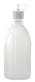 Bílá plastová láhev vybavená špičatou nálevkou. Kvalitně zpracovaný výrobek, který je opatřen měrkou.