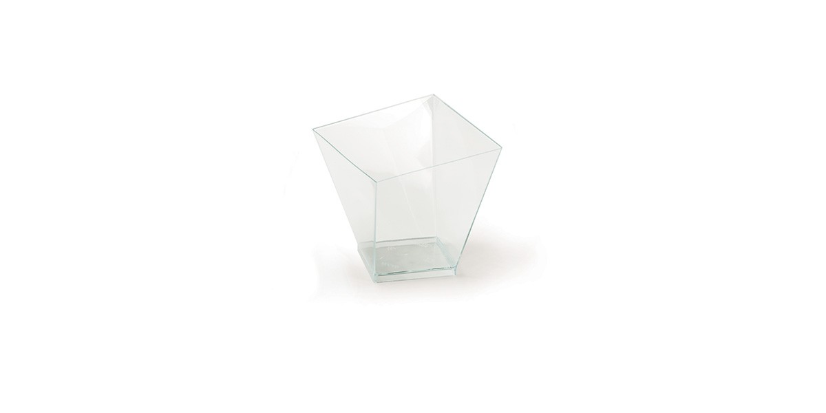 Hranatý pohár má zkosené strany a díky výrobnímu materiálu (PS), který připomíná plexisklo se v něm zajímavě odráží světlo a vytváří se duhové odlesky. Pohár vydrží teploty max. 40°C. Neservírujte v něm horké pokrmy. Rozměry: 7,2 x 7,2 x 7,9 cm.