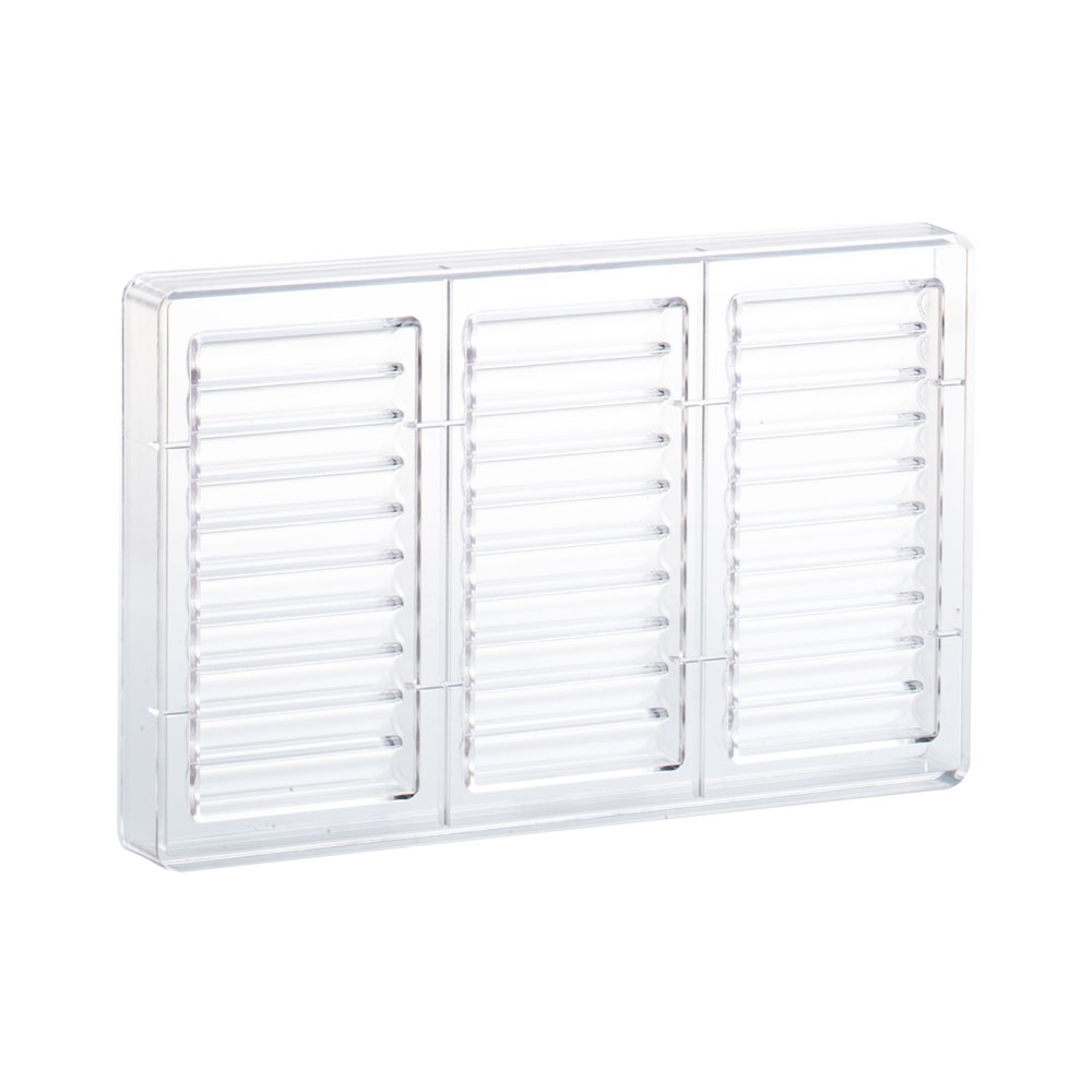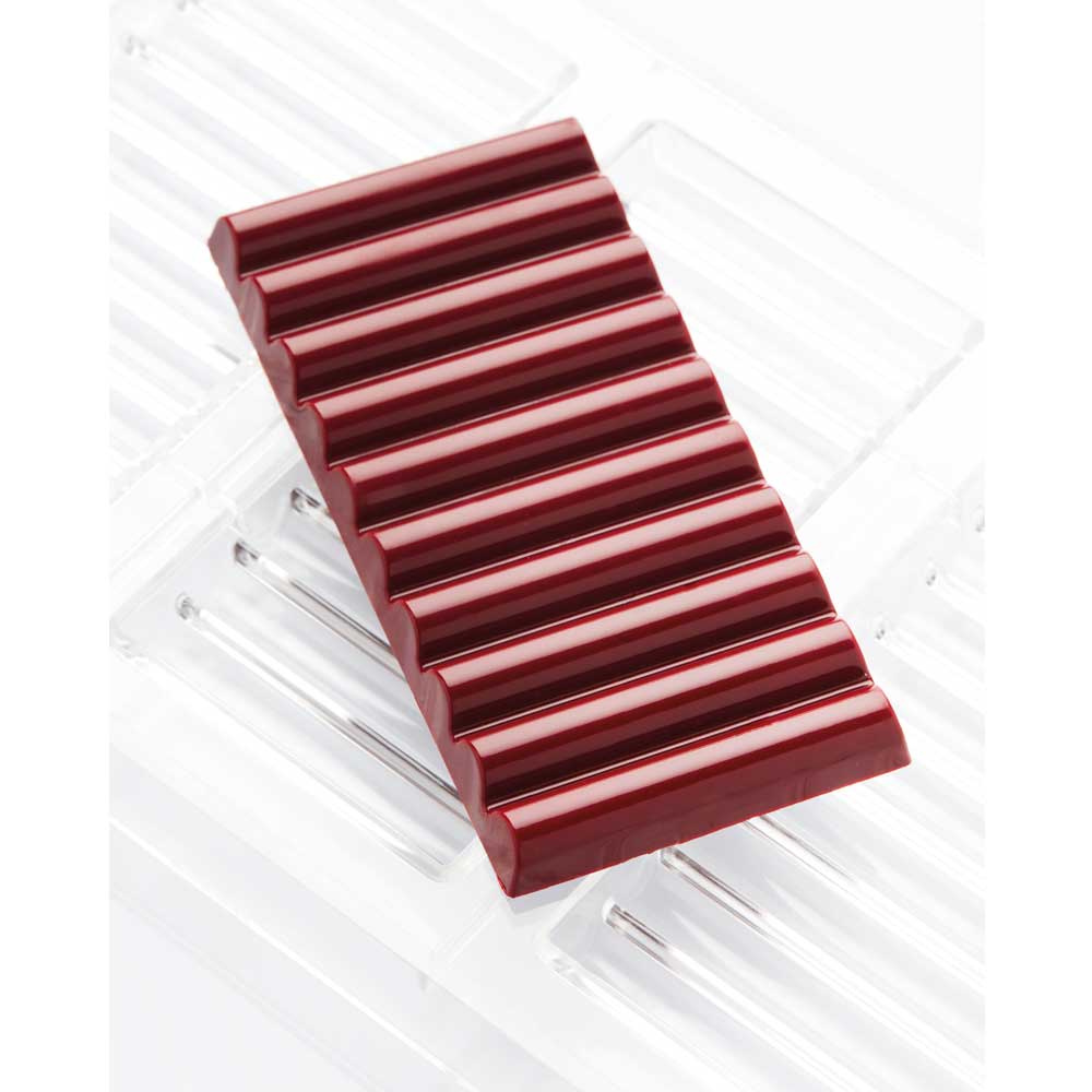 Polykarbonátové formy pro čokoládové tabulky s geometrickými a základními liniemi, pro interpretaci současných trendů. Vyrobena z polykarbonátu, který umožní snadné vyjmutí hotové čokolády. Velikost produktu: 275 x 175 mm Rozměr tyčinky: 140 x 69,5 h 11 mm Počet produktů: 3 ks Hmotnost hotového výrobku: 98 g
