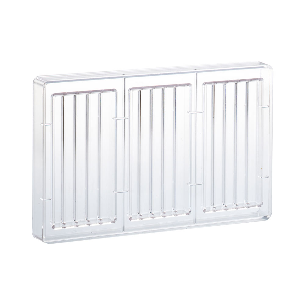 Polykarbonátové formy pro čokoládové tabulky s geometrickými a základními liniemi, pro interpretaci současných trendů. Vyrobena z polykarbonátu, který umožní snadné vyjmutí hotové čokolády. Velikost produktu: 275 x 175 mm Rozměr lišty: 138 x 68 h 11 mm Produktivita objektu: 3 ks Hmotnost hotového výrobku: 103 g