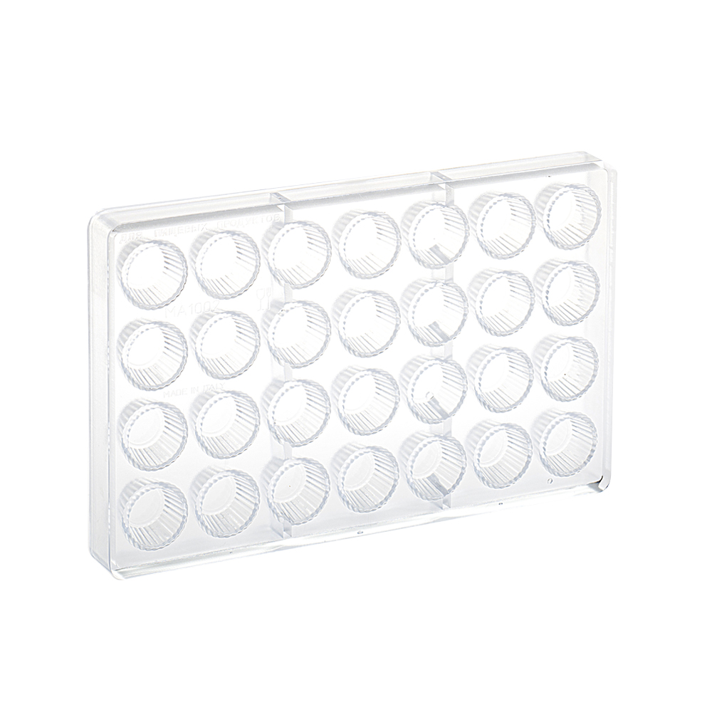 Čokoládové formy na pralinky v krásném designu a z kvalitní výroby, které jsou k dispozici v jakékoliv verziu kombinují estetickou chuť, kvalitu materiálů a spolehlivost, aby se zaručila účinnost, kterou každý profesionál v tomto druhu produktu hledá. Formy jsou vyrobeny z průhledného polykarbonátu, který umožní snadné vyjmutí hotového bonbonu. Velikost produktu: 275 x 175 mm Rozměr pralinky: ? 30 h 19 mm Produktivita objektu: 28 ks Hmotnost hotového výrobku: 12 g
