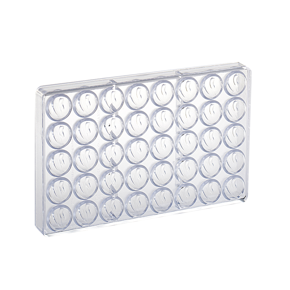 Čokoládové formy na pralinky v krásném designu a z kvalitní výroby, které jsou k dispozici v jakékoliv verziu kombinují estetickou chuť, kvalitu materiálů a spolehlivost, aby se zaručila účinnost, kterou každý profesionál v tomto druhu produktu hledá. Formy jsou vyrobeny z průhledného polykarbonátu, který umožní snadné vyjmutí hotového bonbonu. Velikost produktu: 275 x 175 mm Rozměr pralinky: ? 28 h 23 mm Počet produktů: 40 ks Hmotnost hotového výrobku: 10 g