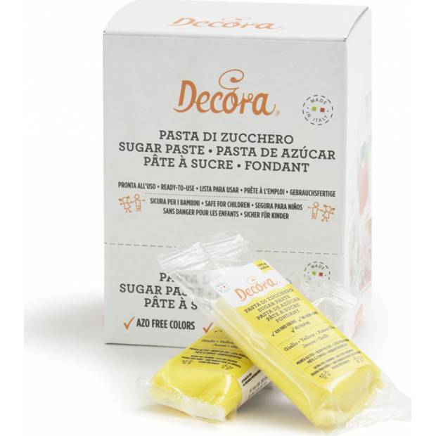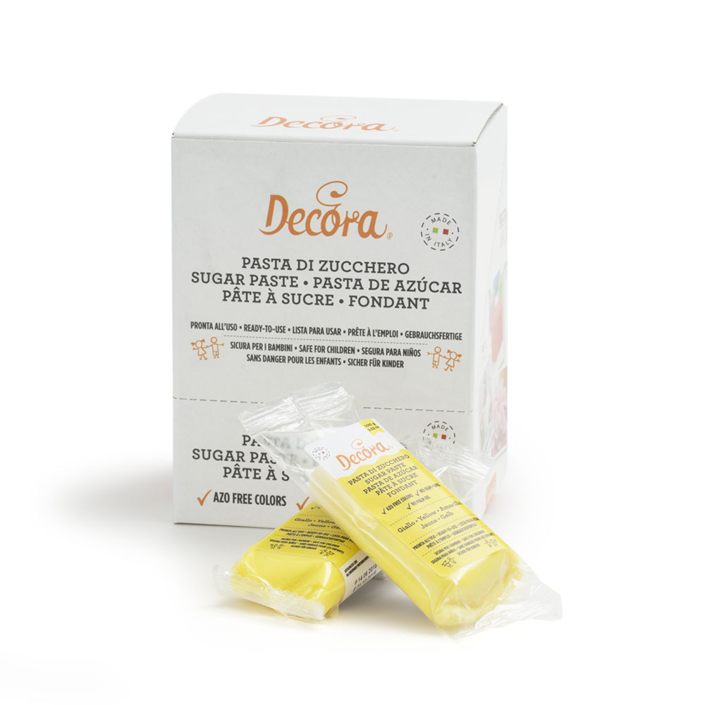 Žlutá modelovací cukrová pasta balená ve vakuových sáčcích. Cukrová pasta má perfektní tvárnost a pružnost danou kakaovým máslem, je ideální pro pokrývání dortů, pro vytváření květin a 3D předmětů, můžete ji natřít ručně nebo pomocí těsta do tloušťky 1 mm, příjemné na chuť díky lehké mandlové vůni. Barevná cukrová pasta nabízí několik dekorativních možností se značnou úsporou z ní činí ideální pastu také pro vytváření předmětů a dekorací, jako jsou květiny a listy, a zajišťuje, že předměty a dekorace zůstanou dokonalé bez rizika zhroucení a zlomení.Bez azobarviva, palmového oleje a GMO. Balení 100 gr.