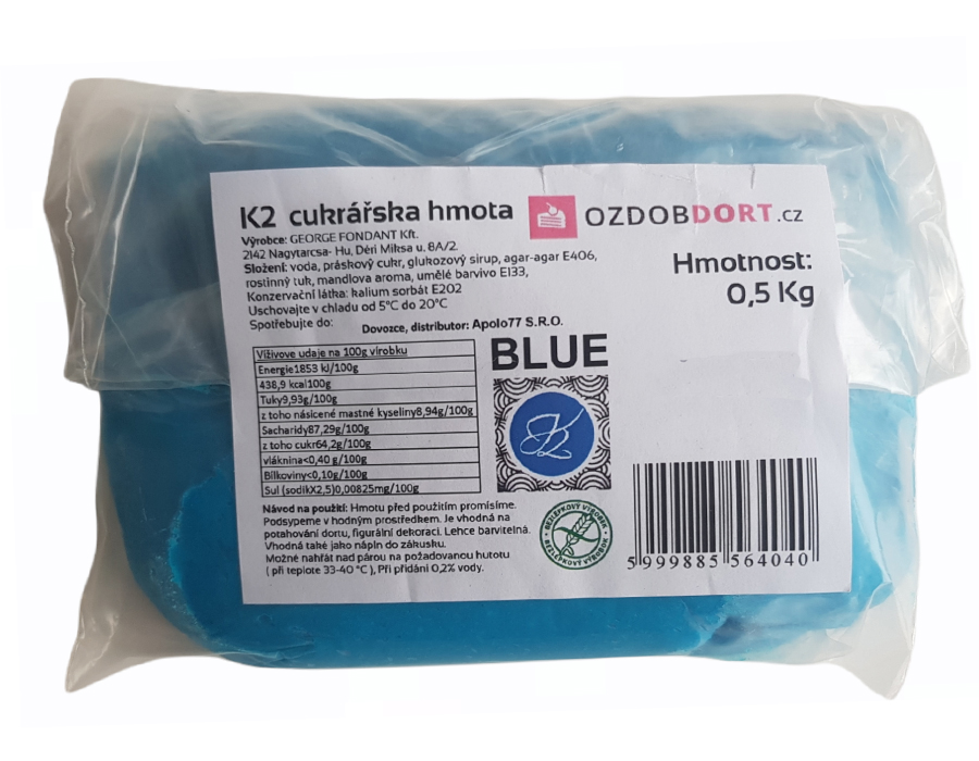 Kvalitní maďarská potahovací hmota s krásně modrou barvou a příjemným mandlovým aroma. Je perfektní na potahování jakýchkoliv dortů, naopak se nehodí na modelování figurek a růží. Má naprosto perfektní vlastnosti. Lze ji použít okamžitě.