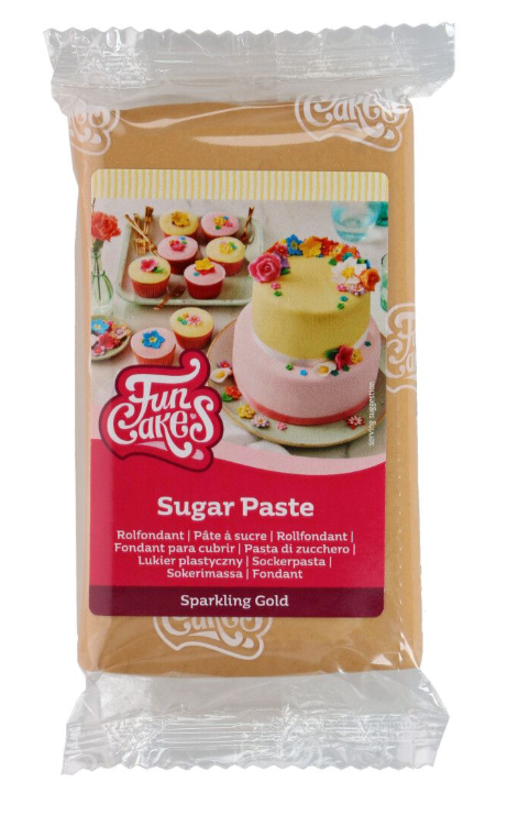 Potáhnout dorty můžete i touto zářivou a elegantní cukrovou pastou. Zvolte tuto jiskřivě zlatou cukrovou pastu, která je pružná, hladká a snadno se s ní pracuje.